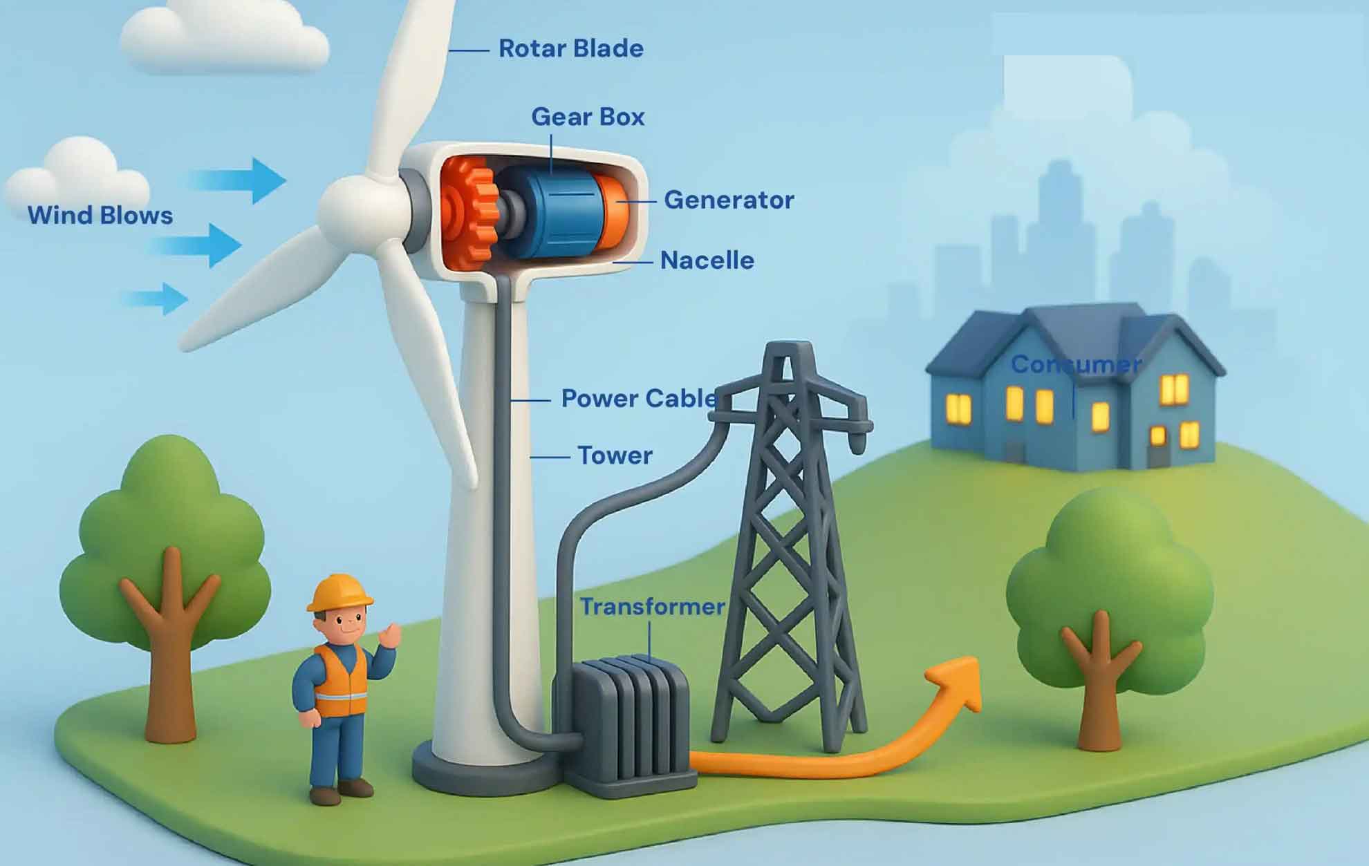 Wind power plants, utilizing wind energy, are another clean and renewable source for electricity generation. In these plants, wind turbines act as converters of the wind’s kinetic energy into electrical energy. Designing and constructing wind power plants, especially in areas with high wind potential (such as coastal or mountainous regions), can have a significant impact on sustainable energy supply. In these projects, in addition to selecting suitable turbines, careful analysis of climatic conditions and regional topography is crucial to maximize the plant’s efficiency.